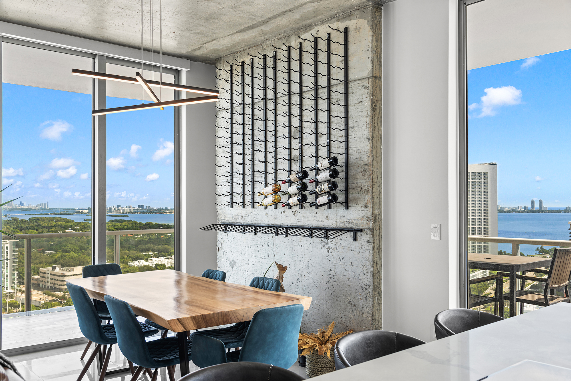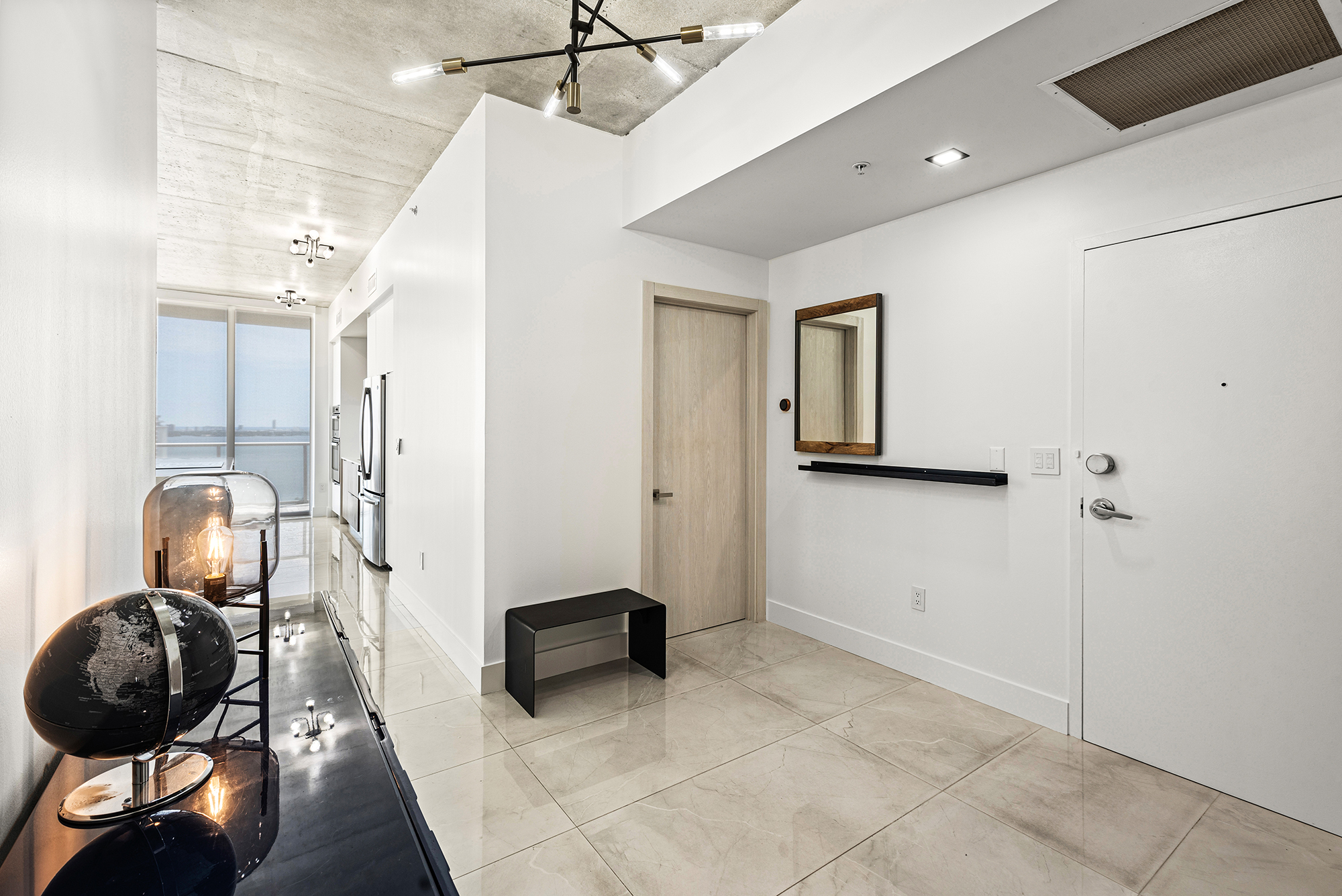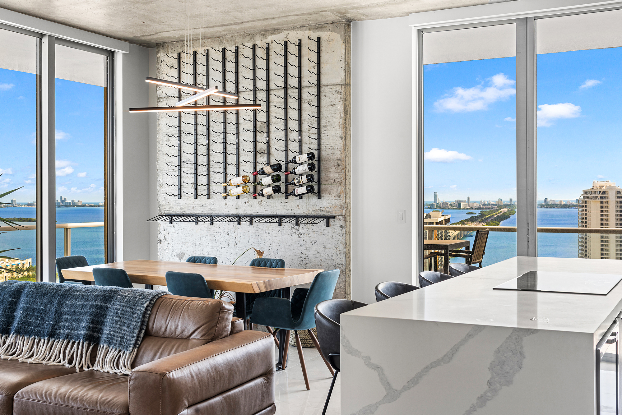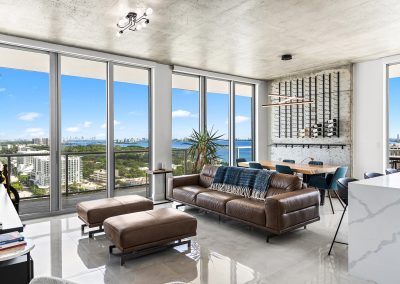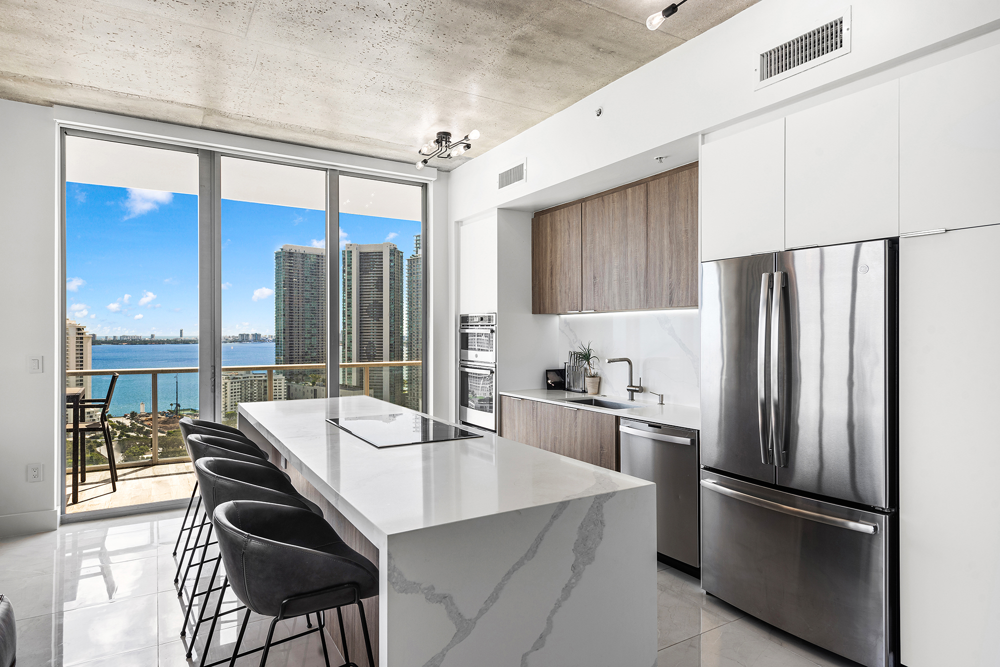 Renovated with style, this 3-bed/2.5-bath NE corner residence on a high floor at 2Midtown offers breathtaking views of Biscayne Bay and the skyline. With over 2,200 sq. ft. of meticulously remodeled living space, this unit features a custom two-tone kitchen with a quartz waterfall island, upgraded bathrooms, and Opustone accent walls. The primary bath is outfitted with a Hansgrohe shower system, and the unit includes designer doors and closets, restored concrete ceilings, and oversized Parmesa Ceramica tiles. The expansive wraparound terrace offers dramatic day and night views.