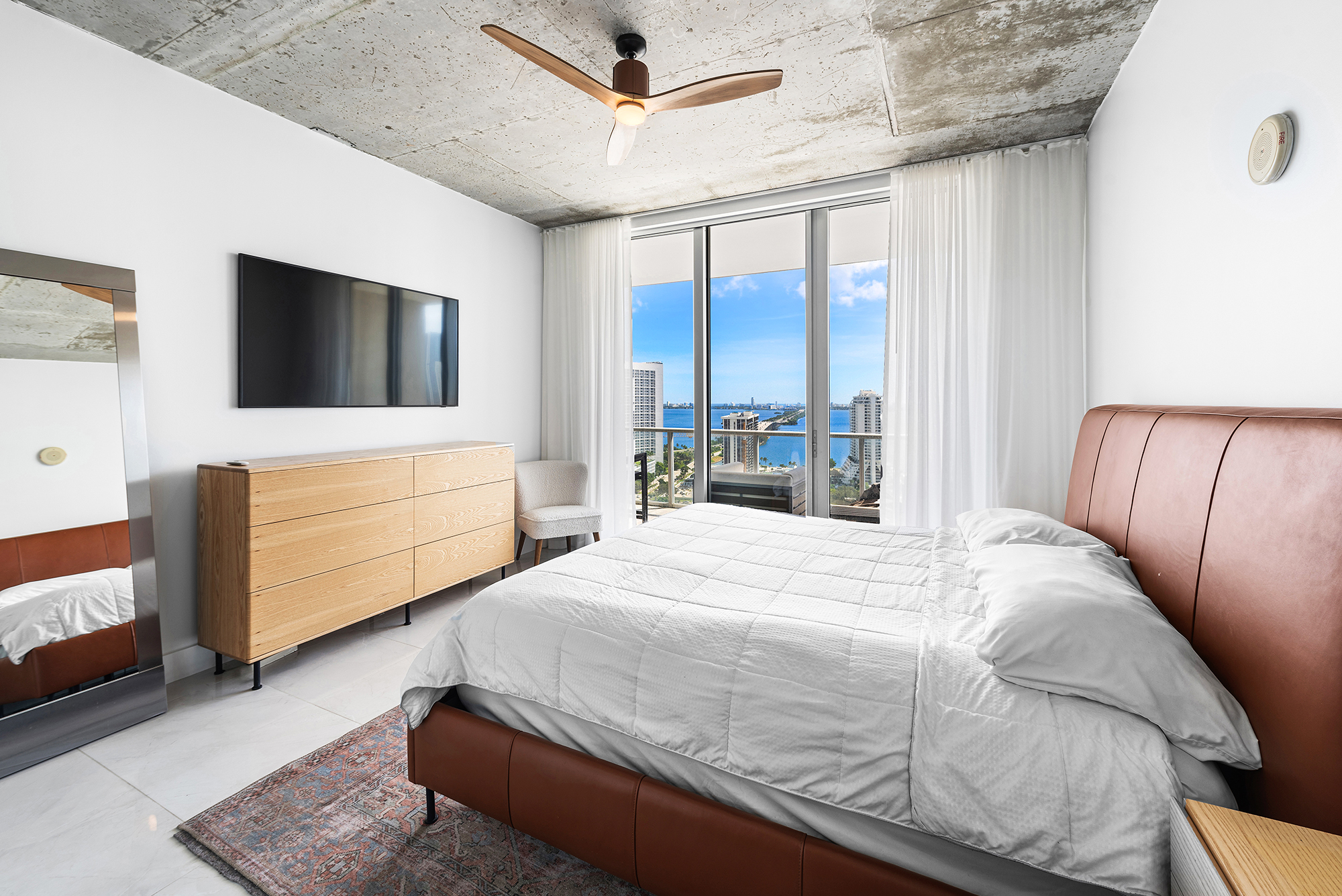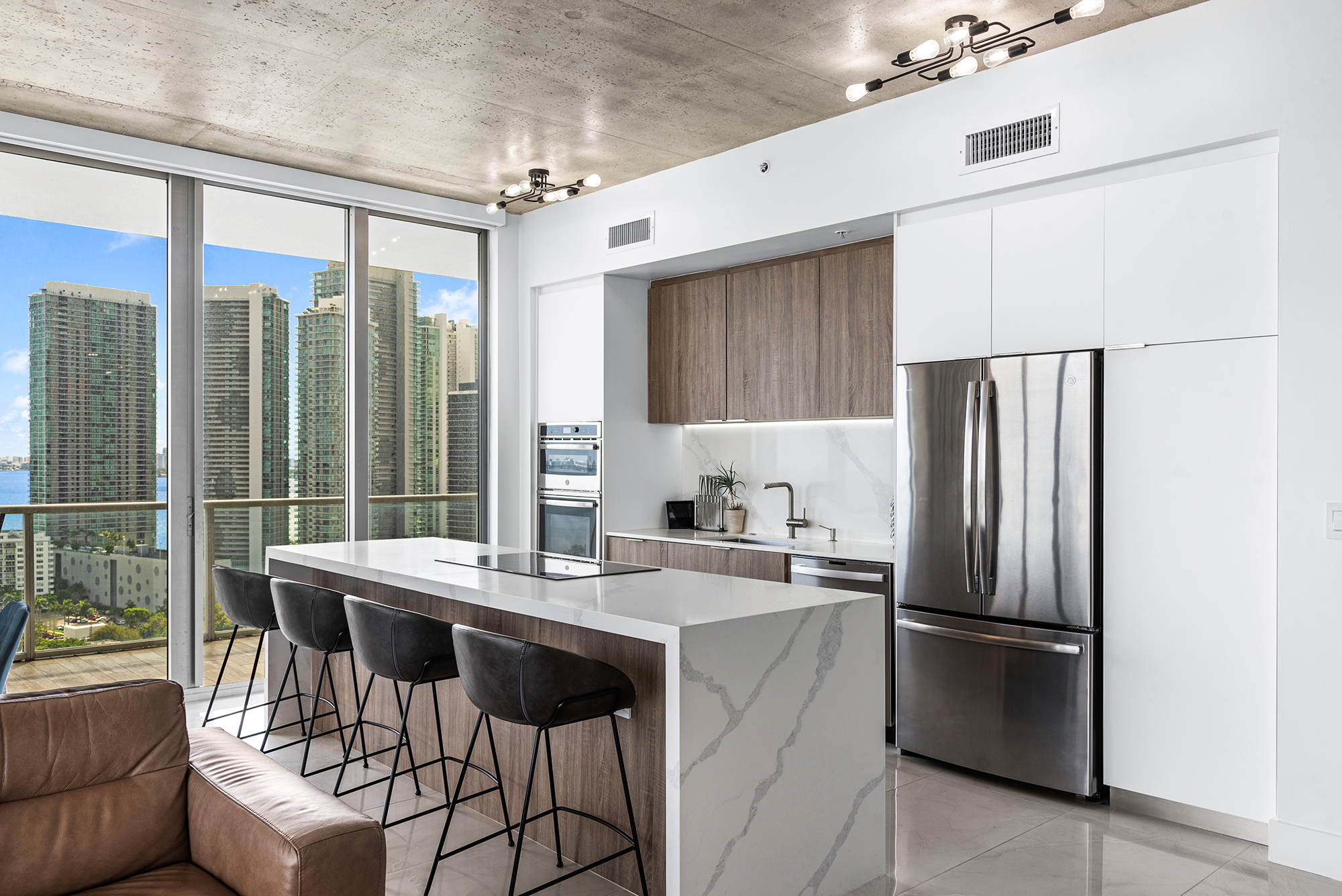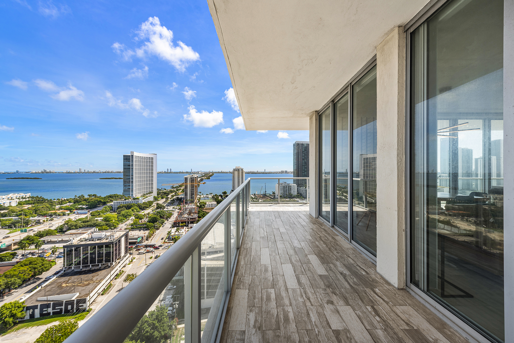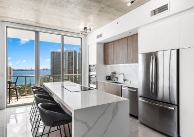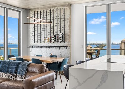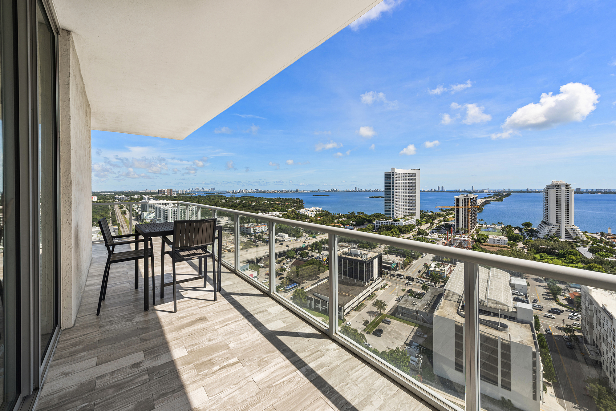 Renovated with style, this 3-bed/2.5-bath NE corner residence on a high floor at 2Midtown offers breathtaking views of Biscayne Bay and the skyline. With over 2,200 sq. ft. of meticulously remodeled living space, this unit features a custom two-tone kitchen with a quartz waterfall island, upgraded bathrooms, and Opustone accent walls. The primary bath is outfitted with a Hansgrohe shower system, and the unit includes designer doors and closets, restored concrete ceilings, and oversized Parmesa Ceramica tiles. The expansive wraparound terrace offers dramatic day and night views.