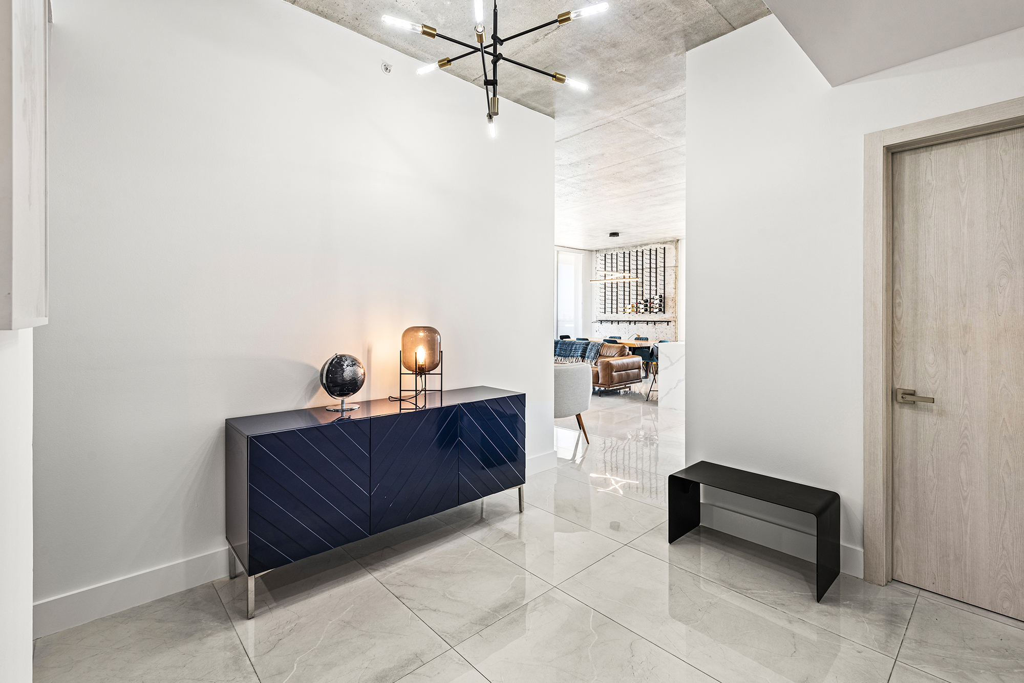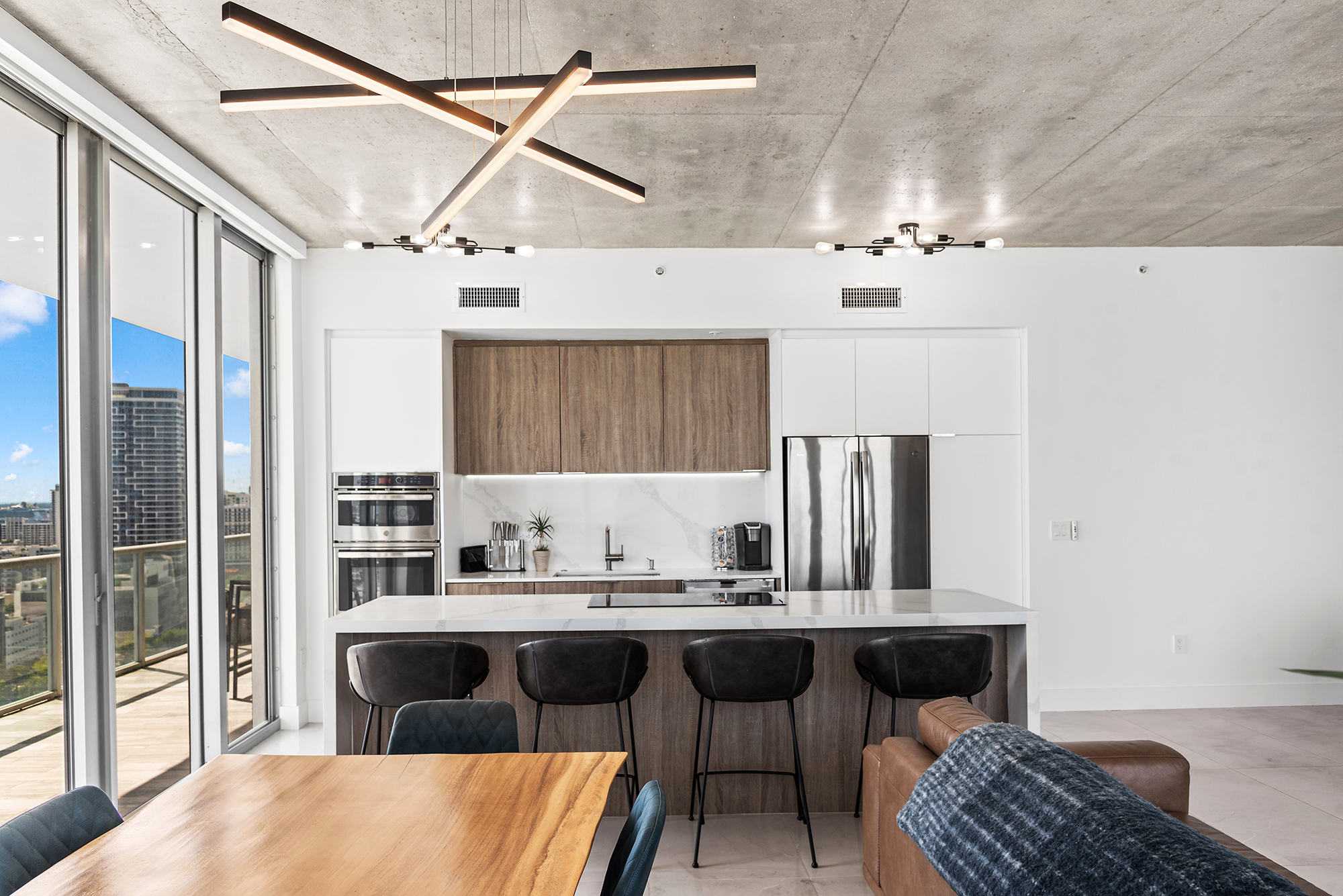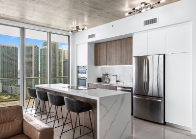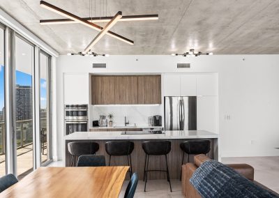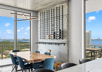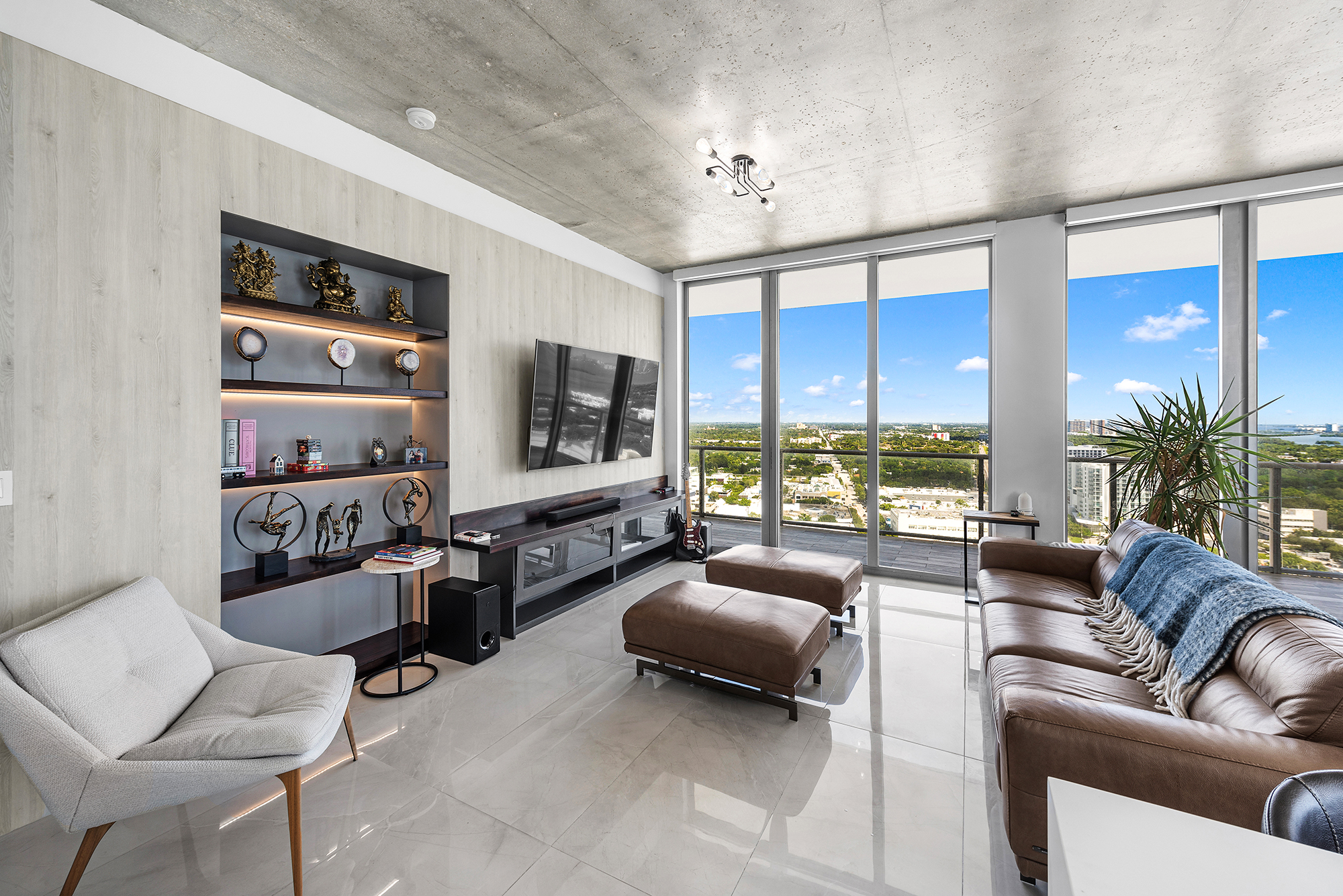 Renovated with style, this 3-bed/2.5-bath NE corner residence on a high floor at 2Midtown offers breathtaking views of Biscayne Bay and the skyline. With over 2,200 sq. ft. of meticulously remodeled living space, this unit features a custom two-tone kitchen with a quartz waterfall island, upgraded bathrooms, and Opustone accent walls. The primary bath is outfitted with a Hansgrohe shower system, and the unit includes designer doors and closets, restored concrete ceilings, and oversized Parmesa Ceramica tiles. The expansive wraparound terrace offers dramatic day and night views.